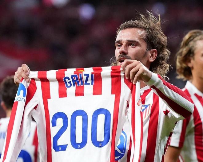 这是他代表马竞在各项赛事打入的第200球,这位法国前锋在进球后展示“200号”球衣。
